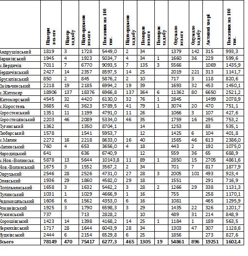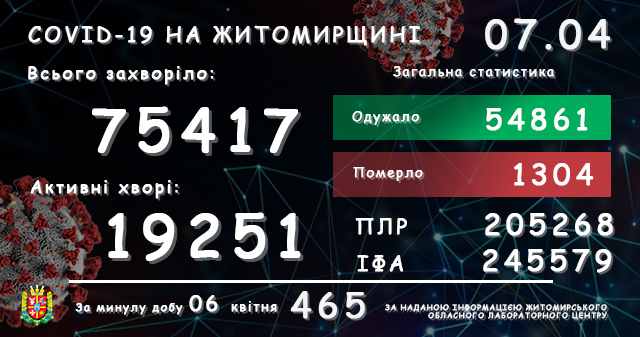 Станом на 9.00 7 квітня в Житомирській області лабораторно підтверджено 75417 випадків коронавірусної хвороби. За минулу добу, 6 квітня, виявлено 465 нових випадків COVID-19. За увесь час пандемії від ускладнень померли 1304 людей, упродовж минулої доби зафіксували 18 летальних випадків. Всього одужали 54861 людина, активних хворих – 19251.