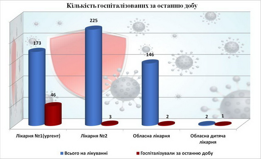 За останню добу в лікарню №1 з COVID-19 госпіталізували 46 людей, всього на лікуванні знаходиться 173; в лікарню №2 – 3 людини, всього на лікуванні 225; в дитячу лікарню – 1 дитину, всього на лікуванні 2. Також наведені дані по обласні лікарні – всього на лікуванні з коронавірусною хворобою там перебуває 146 пацієнтів, 2 госпіталізовані за останню добу.