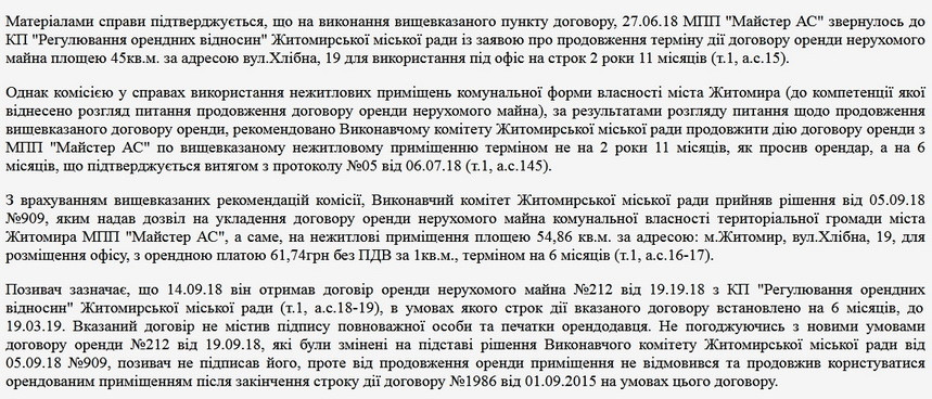 В матеріалах суду зазначено, що з 1 вересня 2015 року МПП «Майстер АС» орендувало на вул.Хлібна, 19 приміщення площею 45 кв.м. під офіс. Перед завершенням терміну оренди підприємство звернулось до КП «Регулювання орендних відносин» із заявою про продовження терміну дії договору оренди нерухомого майна площею 45 кв.м. на строк 2 роки 11 місяців, але виконавчий комітет Житомирської міської ради прийняв рішення від 05.09.18 №909, яким надав дозвіл на укладення договору оренди нерухомого майна комунальної власності територіальної громади міста Житомира МПП «Майстер АС», а саме, на нежитлові приміщення площею 54,86 кв.м. за адресою: м.Житомир, вул.Хлібна, 19, для розміщення офісу, з орендною платою 61,74 грн без ПДВ за 1 кв.м., терміном на 6 місяців.