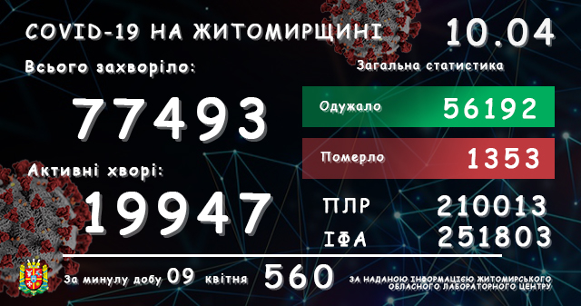 Станом на 9:00 год. 10 квітня 2021 року в Житомирській області лабораторно підтвердили 77493 випадки коронавірусної хвороби. За минулу добу, 9 квітня, було зареєстровано 560 нових інфікування COVID-19. За період пандемії від ускладнень хвороби померли 1353 пацієнти (18 – за минулу добу). Всього одужали 56192 жителі області, нині активних хворих – 19947 осіб.