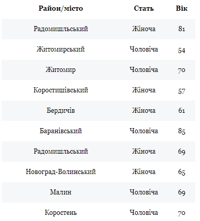 Як інформує пресслужба ОДА з посиланням на дані обласного лабораторного центру, за минулу добу на Житомирщині зареєстровано 18 летальних випадків від коронавірусної інфекції.