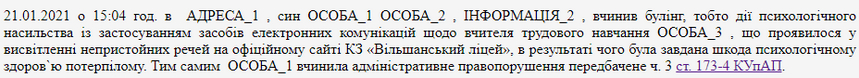 Факт цькування вчителя був зафіксований 21 січня цього року. Учень вчинив булінг щодо вчителя трудового навчання, застосовуючи засоби електронних комунікацій.