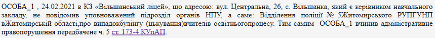 За булінг в Вільшанському ліцеї оштрафували і його директора, який не повідомив до поліції про правопорушення, зафіксоване 24 лютого цього року. Відповідну постанову Чуднівський районний суд виніс 29 березня.