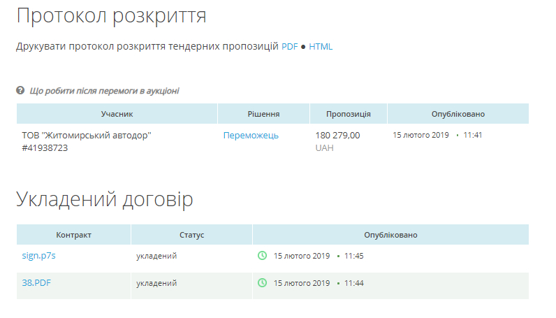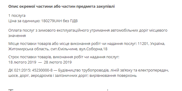 На ресурсі ProZorro оприлюднено інформацію про укладений 15 лютого 2019 року договір на оплату послуг з зимового експлуатаційного утримання автомобільних доріг місцевого значення між Ємільчинською РДА та ТОВ «Житомирський автодор». Ціна договору – 180 тис. 279 грн (без ПДВ). У договорі мова йде про одну послугу, яку підрядник мав надати упродовж 10 днів – з 18 по 28 лютого 2019 року.