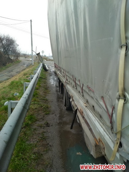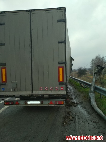 «Прибувши за вказаною адресою, екіпаж з’ясував, що 63-річний водій, який проживає у місті Бельці (Республіка Молдова), керуючи транспортним засобом Mercedes-Benz з напівпричепом, не врахував дорожньої обстановки, не вибрав безпечної швидкості руху, не впорався з керуванням та скоїв наїзд на електроопору освітлення пішохідного переходу, а також відбійник протяжністю 2 метри і дорожні знаки (3.21,5.35.1,5.35.2,4.9)», – розповіла пресофіцер патрульної поліції Житомирської області Тетяна Носадчук.