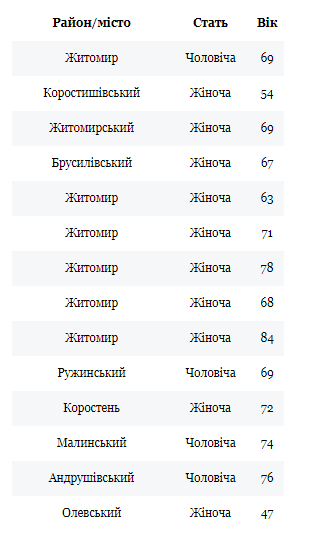 Як інформує пресслужба ОДА з посиланням на дані обласного лабораторного центру, за минулу добу на Житомирщині зареєстровано 14 летальних випадків від коронавірусної інфекції.