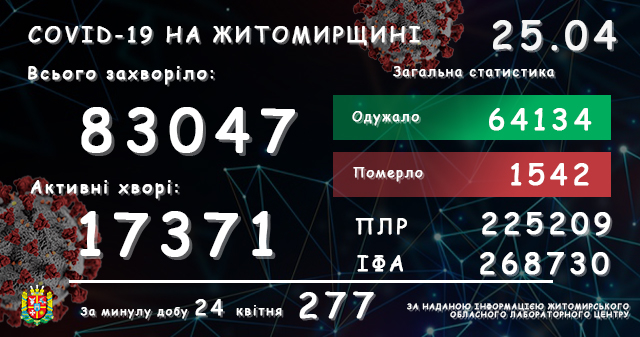 Станом на 9:00 год. 25 квітня 2021 року в Житомирській області лабораторно підтвердили 83047 випадків коронавірусної хвороби. За минулу добу, 24 квітня, було зареєстровано 277 нових інфікувань COVID-19. За період пандемії від ускладнень хвороби померли 1542 пацієнти (11 – за минулу добу). Всього одужали 64134 жителі області, нині активних хворих – 17371 людина.