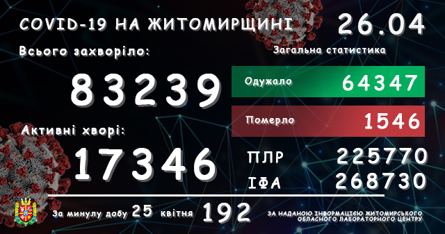 Станом на 9:00 год. 26 квітня 2021 року в Житомирській області лабораторно підтвердили 83239 випадків коронавірусної хвороби. За минулу добу, 25 квітня, було зареєстровано 192 нових інфікування COVID-19. За період пандемії від ускладнень хвороби померли 1546 пацієнтів (4 – за минулу добу). Всього одужали 64347 жителів області, нині активних хворих – 17346 осіб.