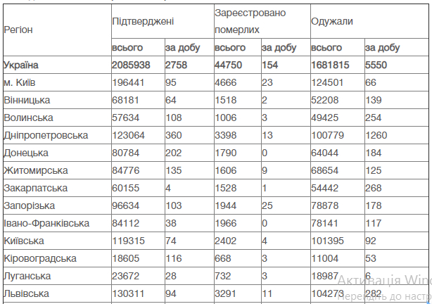 Про це йдеться у таблиці на сайті Міністерства охорони здоров’я.