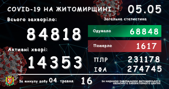 Станом на 9:00 год. 5 травня 2021 року в Житомирській області лабораторно підтвердили 84818 випадків коронавірусної хвороби. За минулу добу, 4 травня, було зареєстровано 16 нових інфікувань COVID-19. За період пандемії від ускладнень хвороби померли 1617 пацієнтів (4 – за минулу добу). Всього одужали 68848 жителів області, нині активних хворих – 14353 особи.