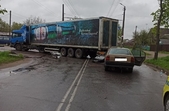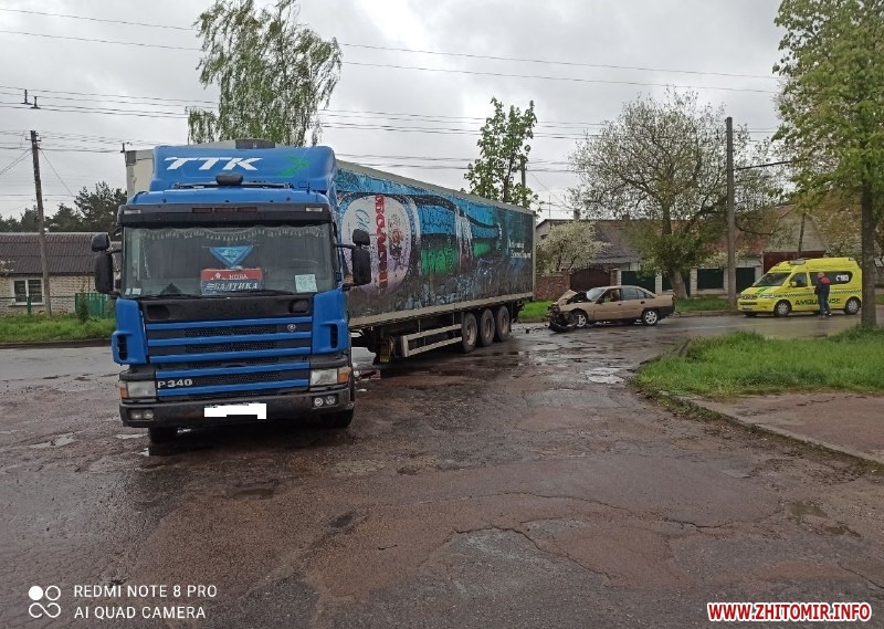 Вранці 8 травня на перехресті вулиць Івана Гонти та Комерційної в Житомирі зіткнулися фура і легковик. Травмованого водія легкового автомобіля госпіталізували медики швидкої допомоги.