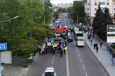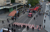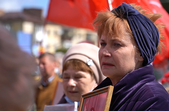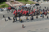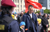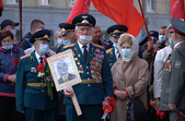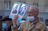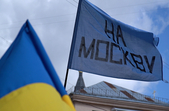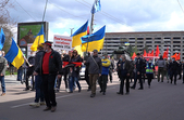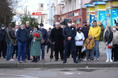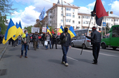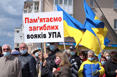 На майдан Перемоги також прийшли й близько десятка людей, які тримали в руках національні прапори України та портрети військових ЗСУ, які загинули внаслідок російської агресії на сході України.