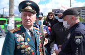Вранці 9 травня кілька близько сотні людей зібрались на майдані Перемоги в Житомирі. Деякі люди прийшли з квітами, хтось тримав в руках портрети військових радянської армії. З одного портрету поліцейські знімали георгіївську стрічку.