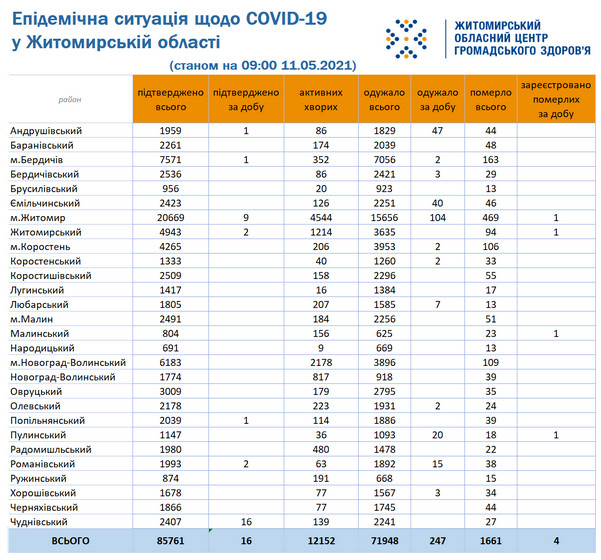 Станом на 9:00 год. 11 травня 2021 року в Житомирській області лабораторно підтвердили 85761 випадок коронавірусної хвороби. За минулу добу, 10 травня, було зареєстровано 16 нових інфікувань COVID-19. За період пандемії від ускладнень хвороби помер 1661 пацієнт (4 – за минулу добу). Всього одужали 71948 жителів області, нині активних хворих –12152 особи.
