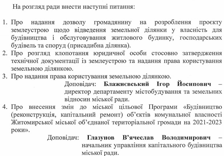 У Житомирі 17 травня о 9:00 год відбудеться позачергова сесія міської ради 8-го скликання.
