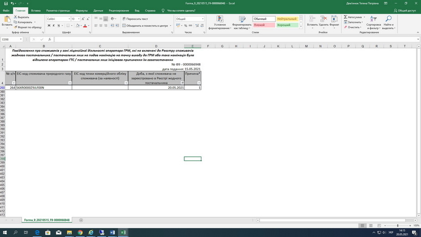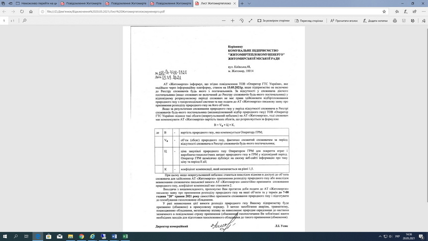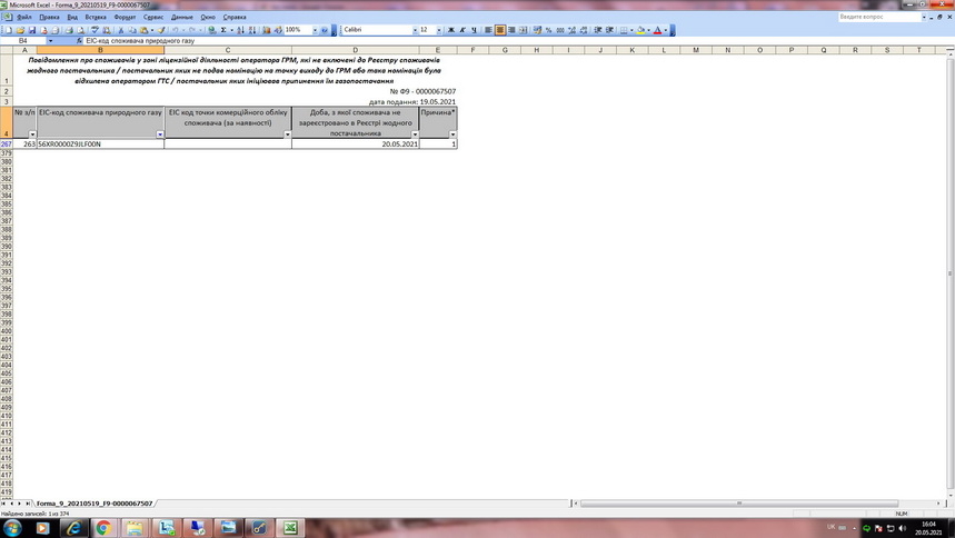 15.05.2021 АТ «Житомиргаз» отримано Форму 9 (Додаток 1) в якій зазначено, що споживача Житомиртеплокомуненерго Жит. міської ради з ЕІС кодом 56XR0000Z9JLF00N не зареєстровано в Реєстрі жодного постачальника з 20.05.2021.