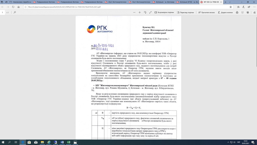 19.05.2021 АТ «Житомиргаз» повідомлено Голову Житомирської обласної державної адміністрації Бунечку В.І. (Додаток4).