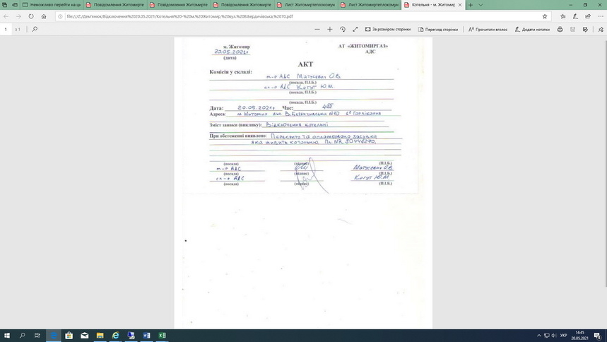 19.05.2021 о 17.21 отримано Форму 9 (Додаток 5) з підтвердженням про необхідність відключення 20.05.2021 споживача Житомиртеплокомуненерго Жит. міської ради.
