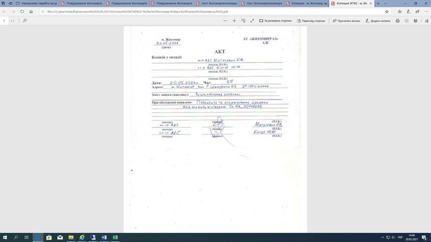 20.05.2021р. відключено від газопостачання наступні об’єкти Житомиртеплокомуненерго Жит. міської ради: