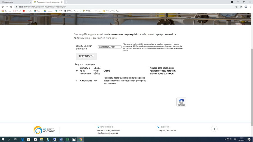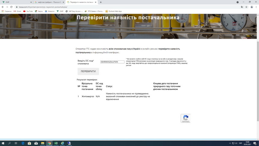 20.05.2021 о 10-00 АТ «Житомиргаз» було перевірено та виявлено на інформаційній платформі Оператора ГРС відсутність постачальника у споживача Житомиртеплокомуненерго Жит. міської ради (Додаток 8).