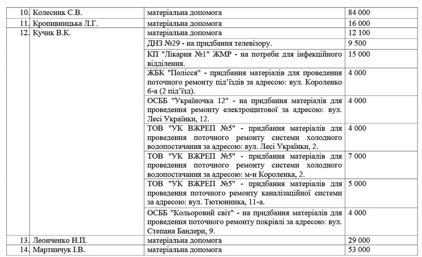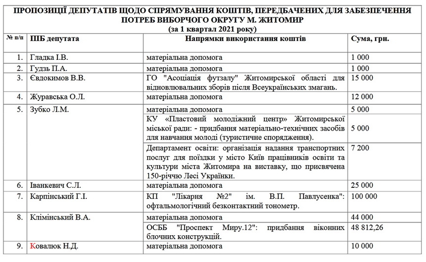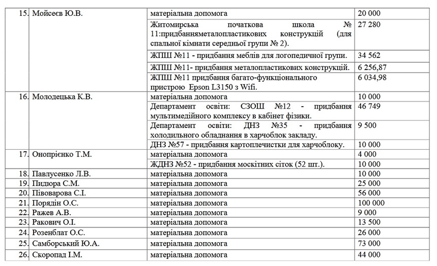 Як повідомляв Житомир.info, у 2020 році, в останній рік каденції, кожен з 42 депутатів Житомирської міської ради сьомого скликання отримав по 200 тисяч гривень з міського бюджету для забезпечення потреб свого виборчого округу, за три квартали 2020 року майже всі депутати використали ці кошти, в основному – на допомогу ОСББ та навчальним закладам і надання матеріальної допомоги (семеро спрямували на матеріальну допомогу всі гроші).