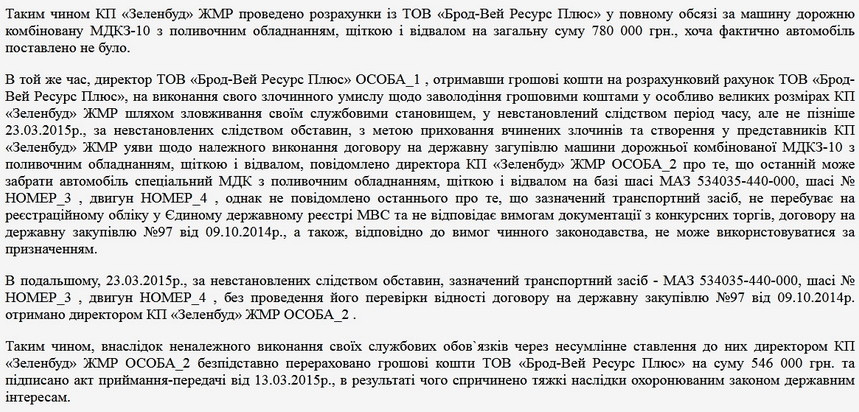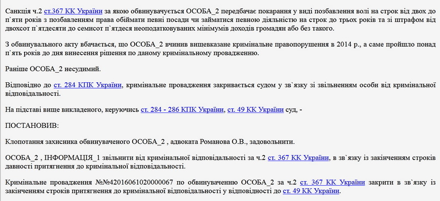 «Внаслідок неналежного виконання своїх службових обов`язків через несумлінне ставлення до них директором КП «Зеленбуд» ЖМР ОСОБА_2 (Валерій Дев'ятко) безпідставно перераховано грошові кошти ТОВ «Брод-Вей Ресурс Плюс» на суму 546 000 грн та підписано акт приймання-передачі від 13.03.2015р., в результаті чого спричинено тяжкі наслідки охоронюваним законом державним інтересам. Своїми необережними діями, які виразились в неналежному виконанні службовою особою своїх службових обов`язків через несумлінне ставлення до них, що спричинило тяжкі наслідки охоронюваним законом державним інтересам, вчинив кримінальне правопорушення, передбачене ч.2 ст.367 КК України. Під час розгляду даного кримінального провадження в суді захисник обвинуваченого ОСОБА_2, адвокат Романов О.В., заявив клопотання про звільнення ОСОБА_2 від кримінальної відповідальності в зв`язку із закінченням строків давності притягнення до кримінальної відповідальності та закриття даного кримінального», - зазначається в ухвалі.