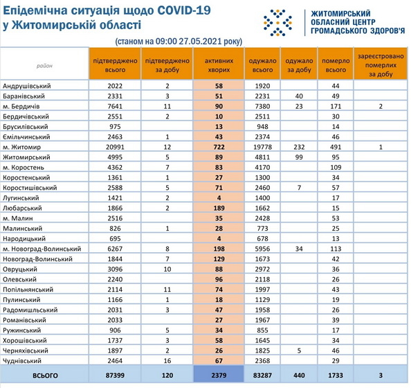 Станом на 9:00 год. 27 травня 2021 року в Житомирській області лабораторно підтвердили 87399 випадків коронавірусної хвороби. За минулу добу, 26 травня, було зареєстровано 120 нових інфікувань COVID-19. За період пандемії від ускладнень хвороби померли 1733 пацієнти (3 – за минулу добу). Всього одужали 83287 жителів області, нині активних хворих – 2379 осіб.