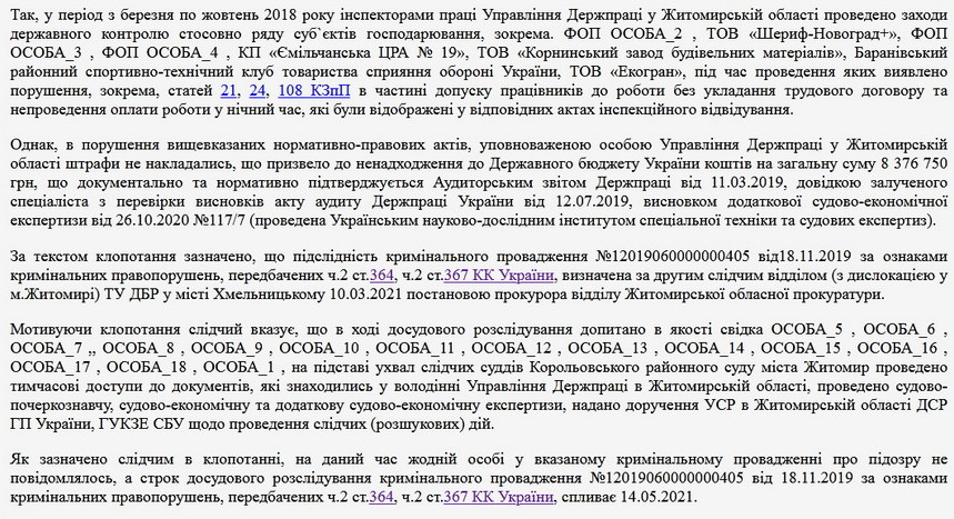 «Досудовим розслідуванням встановлено, що у лютому-березні 2019 року Державною службою України з питань праці проведено внутрішній аудит Управління Держпраці у Житомирській області за 2018 рік, в ході якого встановлено, що начальником Управління Держпраці у Житомирській області ОСОБА_1 (Сергій Сечін – ред.) в період з березня по жовтень 2018 року в порушення вимог Кодексу законів України про працю, Порядку здійснення державного контролю за додержанням законодавства про працю, Порядку накладення штрафів за порушення законодавства про працю та зайнятість населення, не призначалися для розгляду справи про накладення штрафу та не накладались штрафи за порушення, виявлені в ході інспекційних відвідувань ряду юридичних осіб та фізичних осіб підприємців. Так, у період з березня по жовтень 2018 року інспекторами праці Управління Держпраці у Житомирській області проведено заходи державного контролю стосовно ряду суб`єктів господарювання, зокрема. ФОП ОСОБА_2 , ТОВ «Шериф-Новоград+», ФОП ОСОБА_3 , ФОП ОСОБА_4 , КП «Ємільчанська ЦРА № 19», ТОВ «Корнинський завод будівельних матеріалів», Баранівський районний спортивно-технічний клуб товариства сприяння обороні України, ТОВ «Екогран», під час проведення яких виявлено порушення, зокрема, статей 21, 24, 108 КЗпП в частині допуску працівників до роботи без укладання трудового договору та непроведення оплати роботи у нічний час, які були відображені у відповідних актах інспекційного відвідування», - йдеться в матеріалах суду.