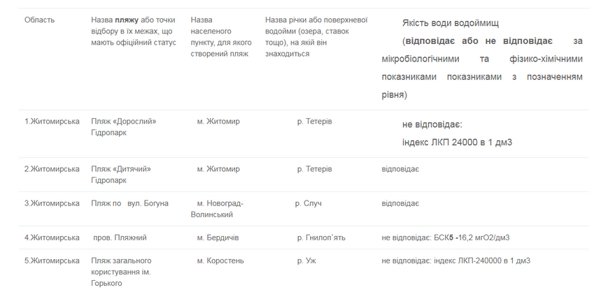 У лабораторному центрі підсумовують: вода в межах дорослого пляжу в містах Житомир (гідропарк) та Коростень (пляж ім. Горького) не відповідає нормам за бактеріологічними показниками, а саме: вміст лактозопозитивних кишкових паличок складає