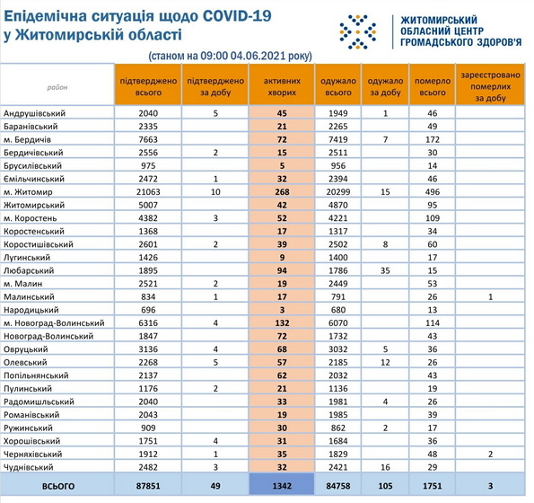 Станом на 9:00 год. 4 червня 2021 року в Житомирській області лабораторно підтвердили 87851 випадок коронавірусної хвороби. За минулу добу, 3 червня, було зареєстровано 49 нових інфікувань COVID-19. За період пандемії від ускладнень хвороби помер 1751 пацієнт (3 – за минулу добу). Всього одужали 84758 жителів області, нині активних хворих – 1342 особи.