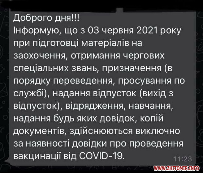 «Інформую, що з 3 червня 2021 року при підготовці матеріалів на заохочення, отримання чергових спеціальних звань, призначення (в порядку переведення, просування по службі, надання відпусток (вихід з відпусток), відрядження, навчання, надання будь-яких довідок, копій документів, здійснюється виключно за наявності довідки про проведення вакцинації від COVID-19», - написав керівник одного з підрозділів поліції.