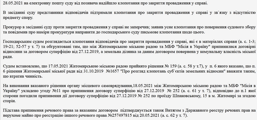 Суд закрив провадження у справі за позовом Житомирської окружної прокуратури до Житомирської міської ради та Міжнародного благодійного фонду «Місія в Україну» щодо повернення громаді міста земельної ділянки на Корбутівці.