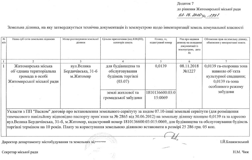 Нагадаємо, на сесії Житомирської міської ради 25 березня 2021 року ПП «Васком» продали земельну ділянку площею 0,0010 га на вул.Велика Бердичівська, 31-б, ціна – 17 тис. 220,60 грн (1722,06 грн за 1 кв.м.).