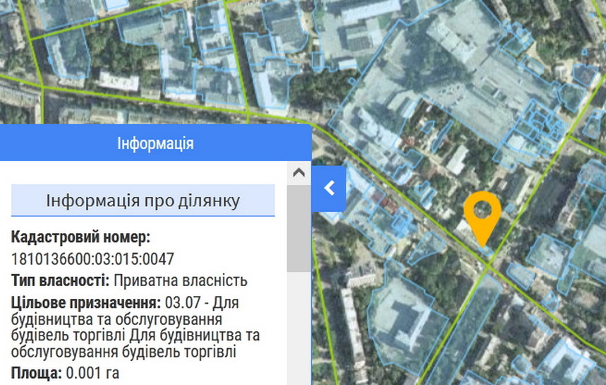 Ділянка, яку прокуратура хоче повернути громаді, має площу 0,0139 га і розташована за адресою: вул. Велика Бердичівська, 31-б. Таку ж адресу має кав’ярня з літнім майданчиком напроти пам’ятника Пушкіну.