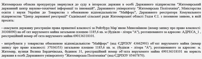 Прокуратура вимагає скасувати державну реєстрацію права приватної власності за Ройтбурд Мар`яною Миколаївною на об`єкт нерухомого майна загальною площею 1185,6 кв. м та витребувати у ТОВ «Майфорс» цей об`єкт нерухомості, розташований за адресою: м. Житомир, вулиця Велика Бердичівська, будинок 31, на користь держави в особі державного університету «Житомирська політехніка».