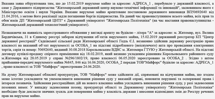 Житомирська обласна прокуратура звернулася до суду в інтересах держави в особі державного підприємства «Житомирський державний центр науково-технічної інформації та інновацій», державного університету «Житомирська політехніка», Міністерства освіти і науки України до товариства з обмеженою відповідальністю «Майфорс» з приводу повернення у державну власність будівні за адресою: м.Житомир, вул. Велика Бердичівська, 31.