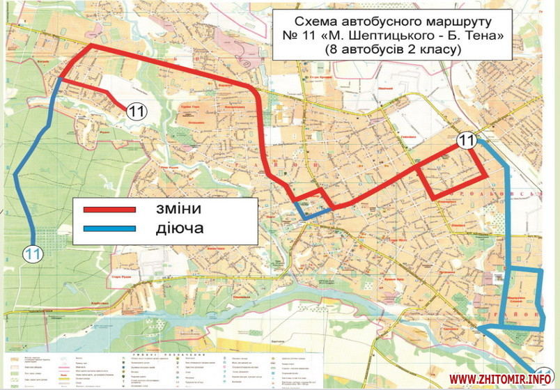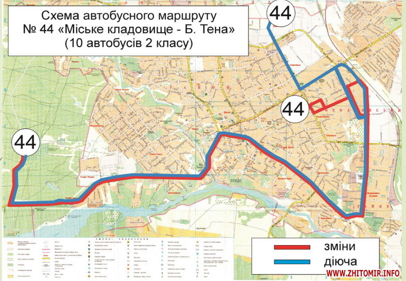 Маршрут№44 рухатиметься по-новому: міське кладовище – Велика Бердичівська - Вітрука - Сльоти- вул. Бориса Тена. Також вулиці Бориса Тена та М. Шептицького, що на Богунії, сполучатиме маршрут №11.