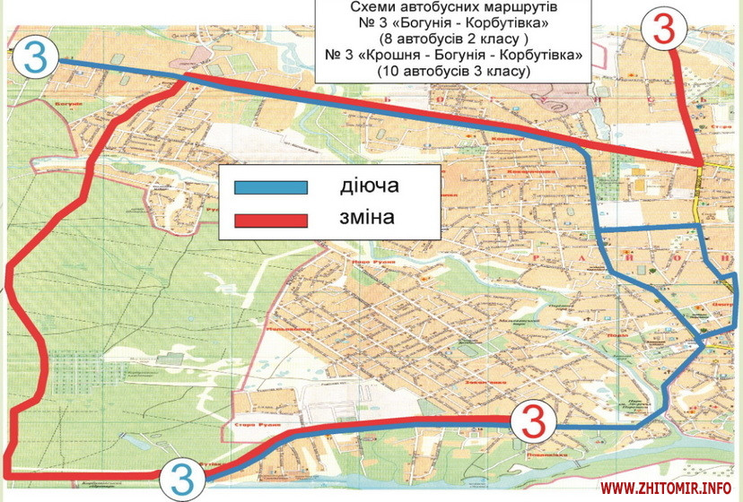 З’являється новий автобусний маршрут Крошня-Богунія-Корбутівка. Раніше подібний маршрут існував, однак пролягав через центр. Автобусний маршрут №3 напряму сполучатиме Крошню та Богунію через проспект Незалежності.