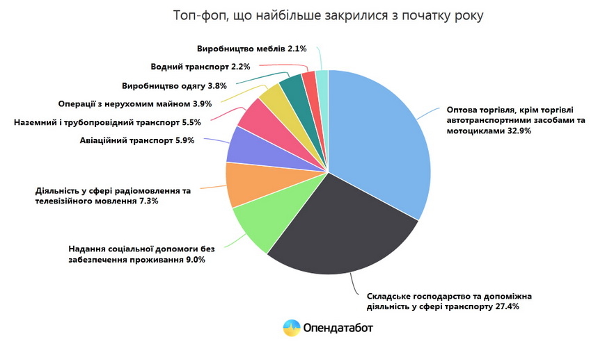 Найбільша кількість ФОПів закрилася за пів року в таких сферах: оптова торгівля (−3449 ФОПів), складське господарство (−2878), надання соціальної допомоги (−946), теле- та радіомовлення (−769), авіаційний транспорт (закрилося 622 ФОПів).