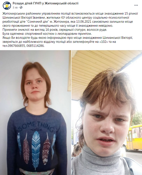 «Житомирським районним управлінням поліції встановлюється місце знаходження 15-річної Шиманської Вікторії Іванівни, жительки обласного центру соціально-психологічної реабілітації дітей «Сонячний дім» (м. Житомир), яка 13.06.2021 самовільно залишила місце свого проживання та до теперішнього часу місце її знаходження невідомо», – інформують у поліції.