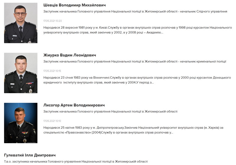 Нагадаємо, в жовтні 2020 року на посаду заступника начальника – начальника кримінальної поліції ГУНП в Житомирській області був призначений Вадим Жмурко, який до цього працював начальником відділу управління стратегічних розслідувань у Вінницькій області. З вересня 2020 року заступником начальника – начальником слідчого управління ГУНП в Житомирській області працює Володимир Шевців, який до призначення на цю посаду був заступником начальника 1-го відділу управління розслідування особливо тяжких злочинів головного слідчого управління Національної поліції України. Із заступників, які працювали з попереднім керівником ГУНП в Житомирській області, залишився лише Артем Лисогор.