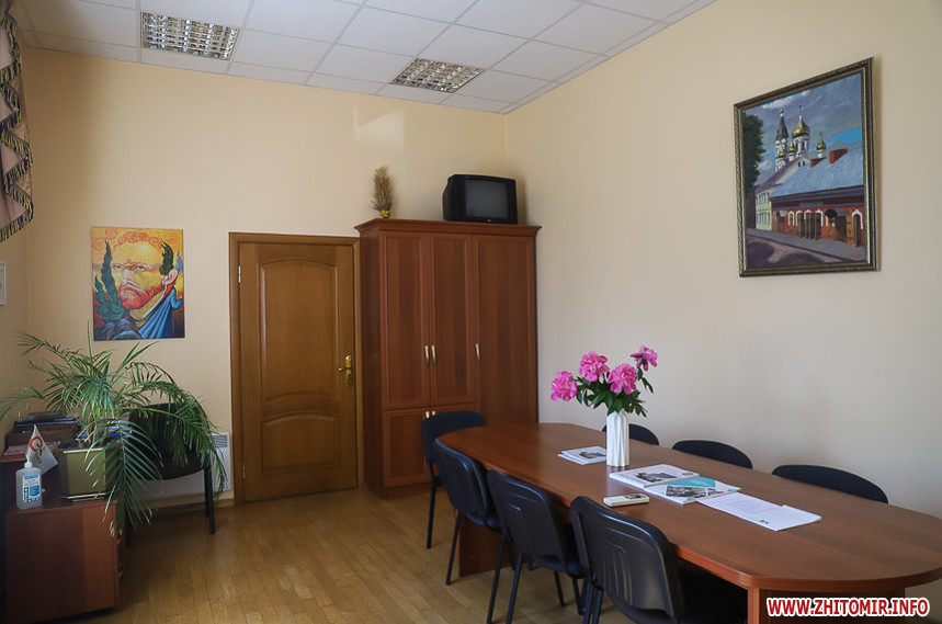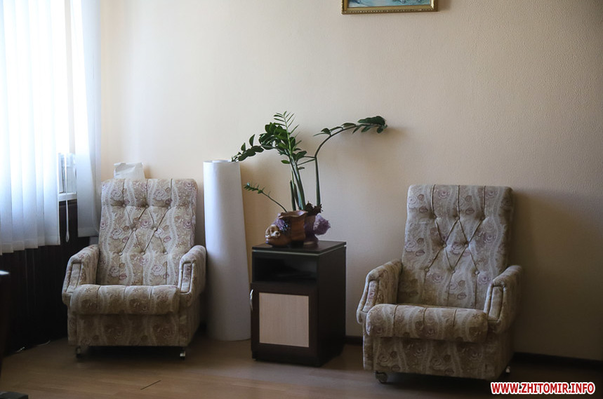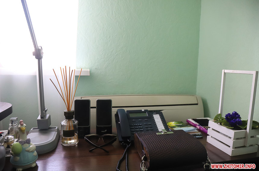 Перша заступниця міського голови Світлана Ольшанська працює у своєму кабінеті з 2018 року, тож Житомир.info вже встиг сфотографувати її кабінет. Хоча сама заступниця і каже, що в неї з 2019 року нічого не змінилося, окрім картин та двох сувенірів, тут стало набагато більше рослин. Орхідеї на вікнах, кілька пальм у горщиках і букет квітучих піонів прикрашають її кабінет зараз.
