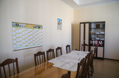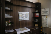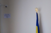 У шафі у нього зберігається кілька подарованих ікон, атлас архітектури та інші книги та документи. На столі лежить еспандер, а у кутку біля дивану - дошка з написами англійською. Старий телевізор (такі будуть у кожному з кабінетів, - авт.) чоловік жартома називає “таємним сейфом”.
