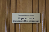 У кабінеті радника міського голови Олександра Черняховича немає жодної картини на стінах та жодної живої рослини. Натомість на видноті тут багато планів, карт та документів. Над кріслом висить герб України, поряд на підлозі стоїть прапор, а під камерою на стіні паперова табличка з написом “Все сказане може бути використане проти вас”. Дві рослини, які тут є - сублімований мох та штучна маленька ялинка - подарунки від управління культури.
