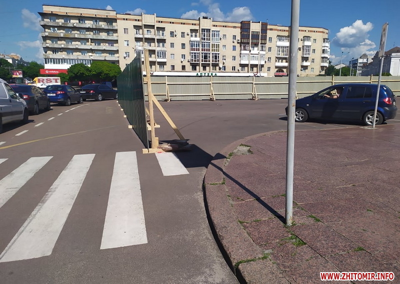 По обіді на майдані Соборному почали встановлювати будівельний паркан, яким тимчасово загородили автомобільну парковку та частину дороги. Поруч на газоні розмістили будівельний вагончик і біотуалет, розклали будматеріали для огорожі й подекуди почали знімати гранітні плити старого покриття пішохідних доріжок.