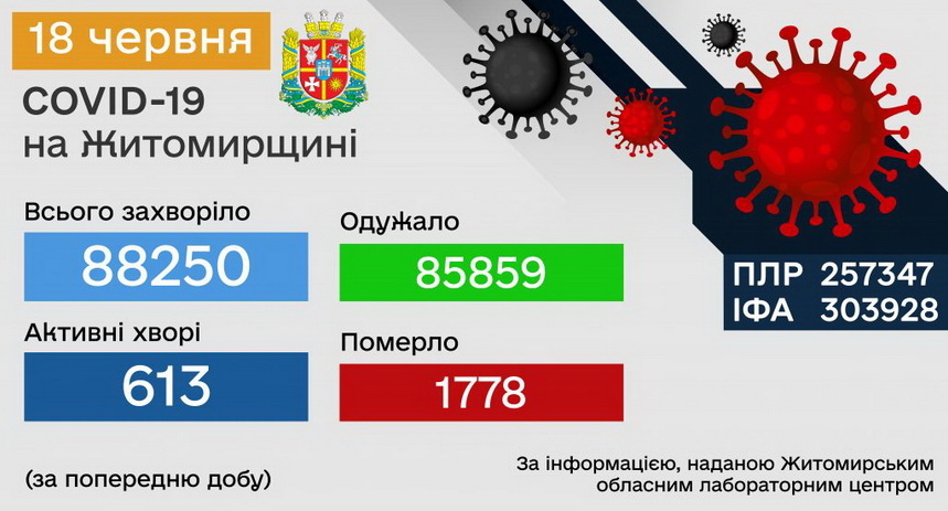 Станом на 9:00 год. 18 червня 2021 року в Житомирській області лабораторно підтвердили 88250 випадків коронавірусної хвороби. За минулу добу, 17 червня, було зареєстровано 27 нових інфікувань COVID-19. За період пандемії від ускладнень хвороби померли 1778 пацієнтів (4 – за минулу добу). Всього одужали 85859 жителів області, нині активних хворих – 613 осіб.