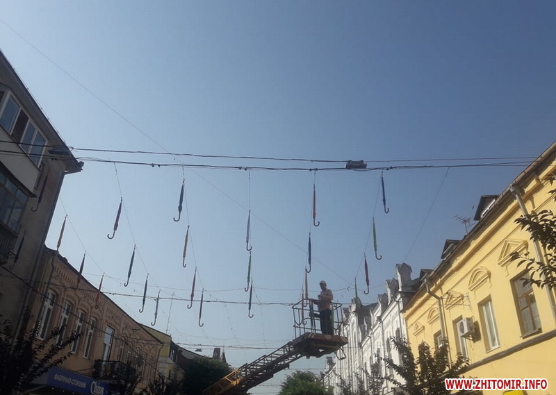 Зранку 24 червня на пішохідній вулиці Житомира почали розвішувати різнокольорові парасольки.