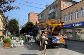 Вже близько 7 години ранку на Михайлівській працювала техніка, за допомогою якої замість «новорічних» парасольок з підсвіткою розвішували літні декорації.