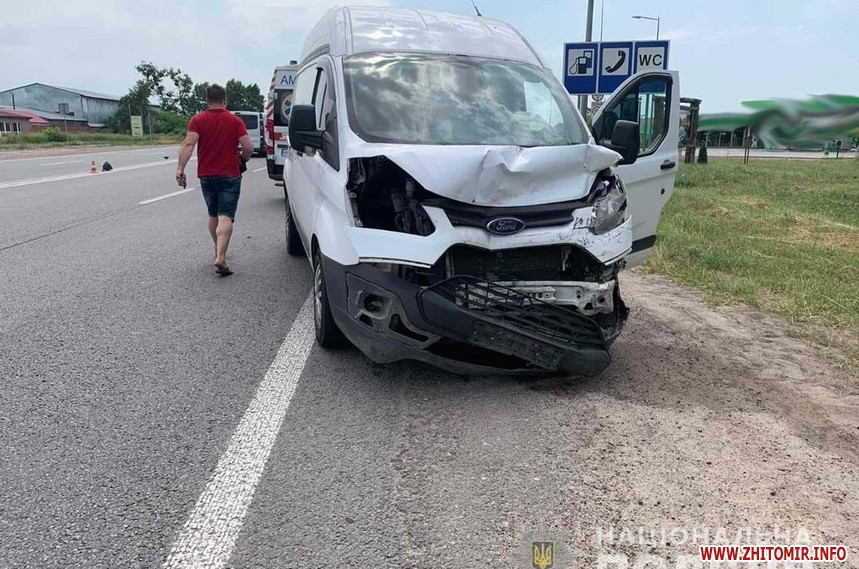 Попередньо, водій автомобіля «Ford Transit», 43-річний житель Коростенського району, рухаючись у напрямку м. Житомира, зіткнувся з автомобілем «ЗАЗ» під керуванням 59-річного місцевого жителя, який зупинився у лівій смузі руху для виконання повороту.