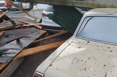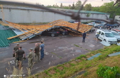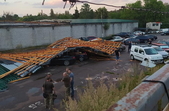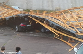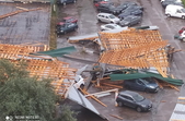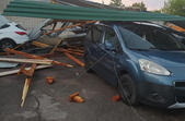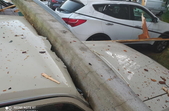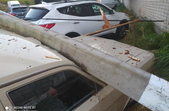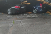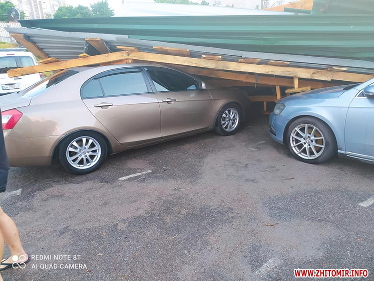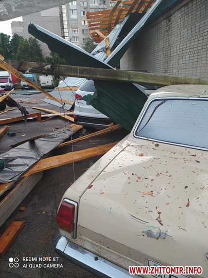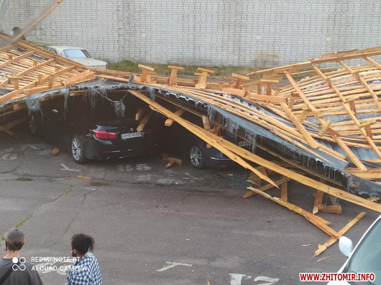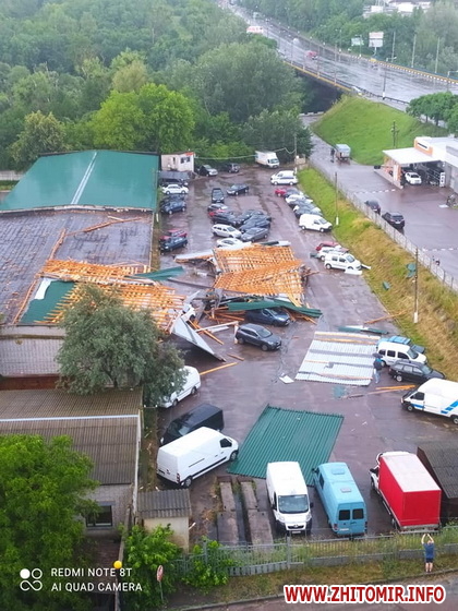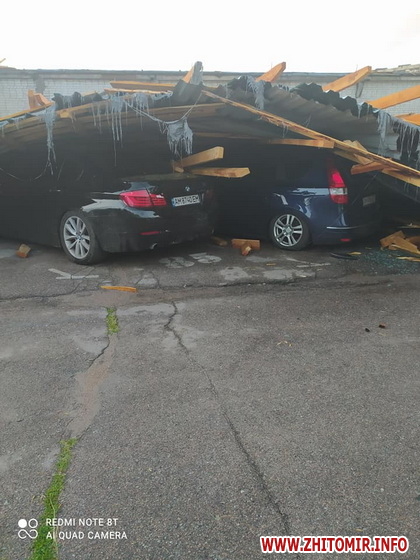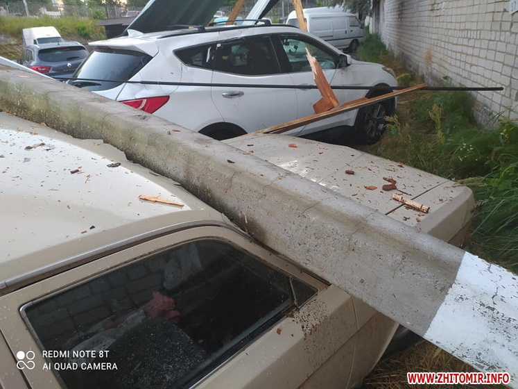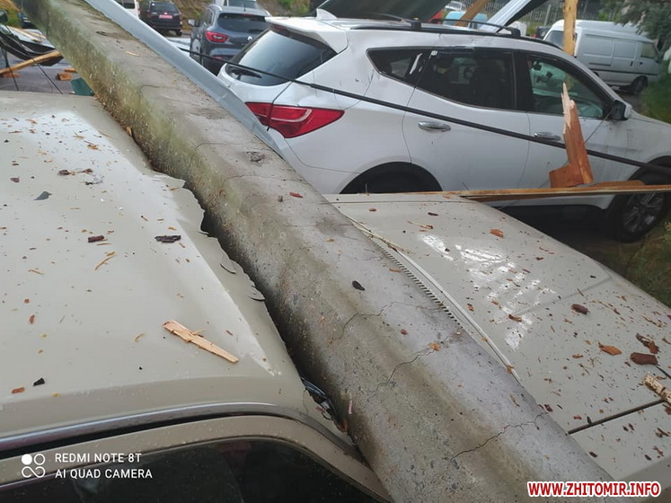 Також у Facebook оприлюднили фото, зроблені в районі Богунського мосту, де 29 червня рвучкий вітер зніс дах будівлі і «кинув» на автомобілі, що були припарковані. На знімках видно, що одну з автівок привалило бетонною електроопорою.